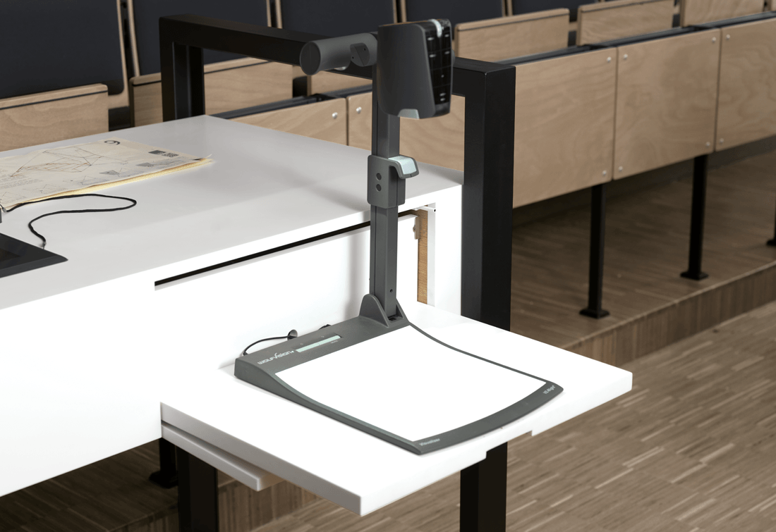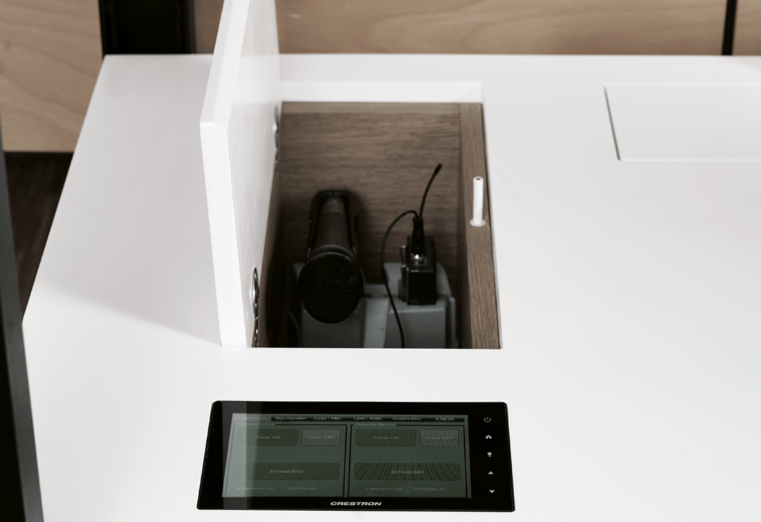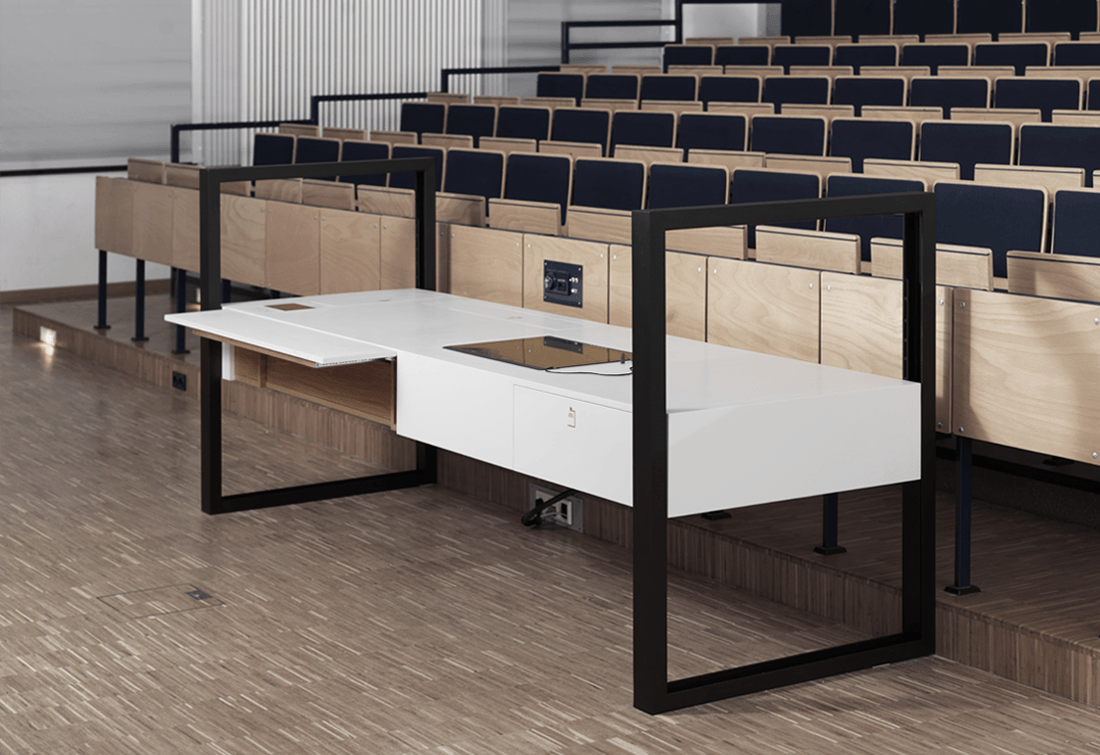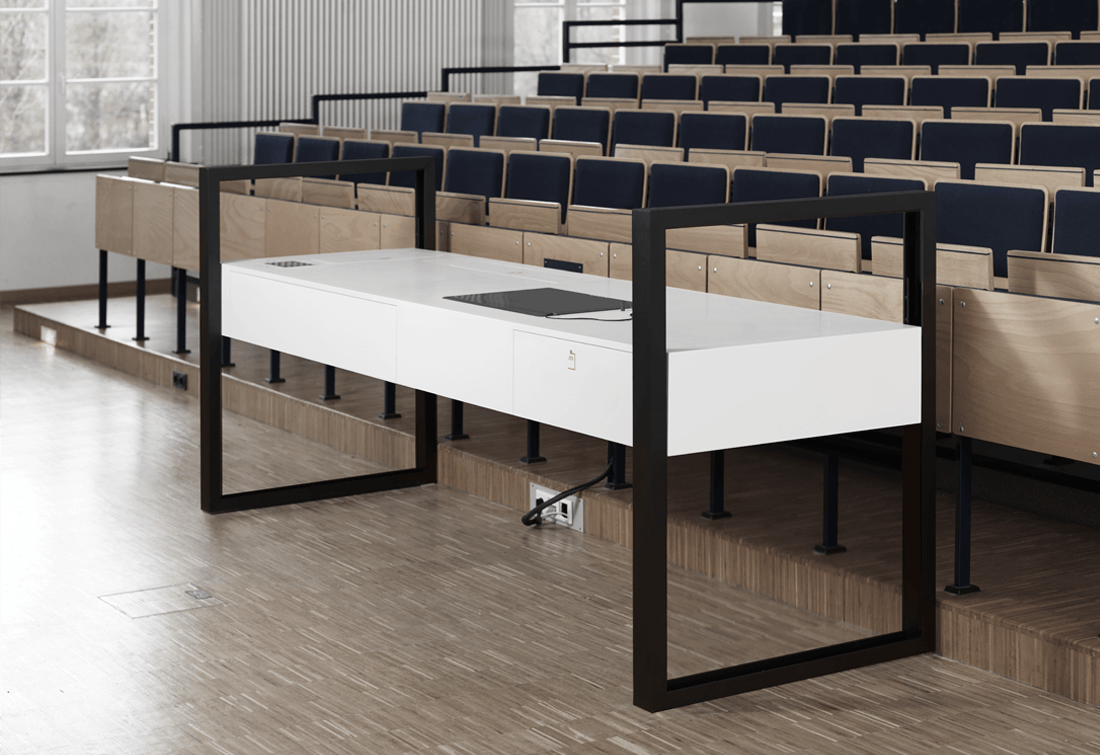 Der Generalist ist ein multimediales Pult, dem man auf den ersten Blick nicht ansieht, was es alles kann. Er vereint alle für ein Medienpult wichtigen Funktionen in einem Korpus. Die vier in den Stahlrahmen versteckten Hydraulikzylinder lassen das Pult um 40 cm in der Höhe verstellen. Ein Frontelement lässt sich hochklappen, sodass auch Rollstuhlfahrer*innen eine bequeme Rednerposition einnehmen können. Mit der eingebauten Technik lässt sich der Raum durch unterschiedlichste Präsentationsmedien bespielen und steuern. Ein schwebend anmutender Korpus bündelt eine Vielzahl an Elementen und gibt jedem Redner*in eine sichere Grundlage für eine erfolgreiche Präsentation.